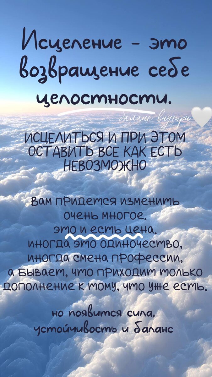 Важное знание, которое пора усвоить всем: Чужие эмоции - не ваша зона ответственности. Вы не несёте ответственность за то, что чувствуют другие. А другие люди не несут ответственность за ваши чувства. А вот ваши границы - это ваша ответственность. И никто не в праве их нарушать. Но мужчина, ни начальник, ни, простите, даже мама. Если их это обижает - это не ваша проблема. Отстаивание своих границ никогда не проходит мягко. Это тяжёлая борьба. В том является и со своими ранее навязанными "нельзя". Можно. Но это полбеды. Как тяжело будет на пути, когда вы поймете, что то, что вас обижает, разочаровывает, делает больно - только ваша ответственность. Таких мало. Пусть 1% населения. Но я знаю, что если вы здесь, то вы входите в этот 1%. Добро пожаловать в мир взрослых. Будет сложно. Окружение будет меняться. Те, кто был с вами, потому что вы удобны - уйдут. Те, кто искренне любит вас - останутся. Спросят, почему вы стали такими. Но у вас уже есть ответ. Любовь - не равно быть уд