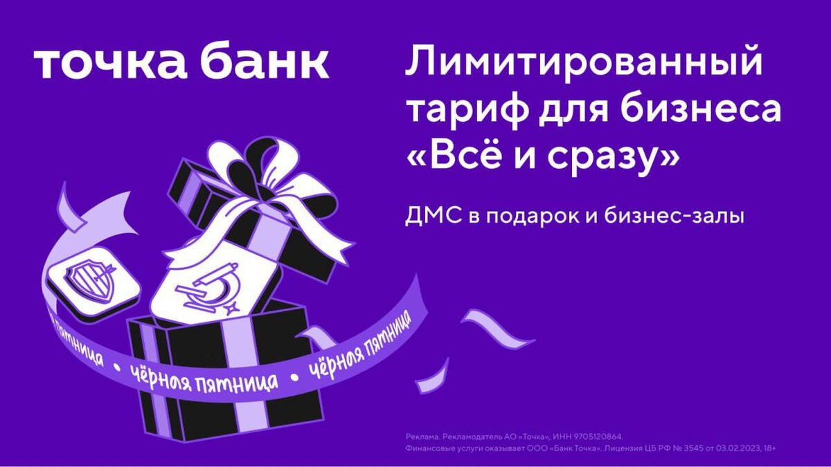 Чёрная пятница: подключите лимитированный тариф «Всё и сразу» от Точка Банка Точка Банк предлагает бизнесменам лимитированный тариф «Всё и сразу» в Чёрную пятницу. Включает 2 месяца ДМС для вас и близких, переводы до 2 000 000 ₽ в месяц без ограничений, повышенные ставки на депозиты, премиальную бизнес-карту с кешбэком до 7%, 2 прохода в бизнес-залы каждый месяц и компенсацию процентов по кредиту в первом месяце до 20 000 баллами лояльности. Тариф действует только до 30 ноября. Подайте заявку и получите специальные условия! ────────── ⚡️Важные новости – без лишнего шума!⚡️ Подпишись на канал и получай только суть: оперативно, чётко, по делу! 👉 ИнфоСплетник | @infospletnik
