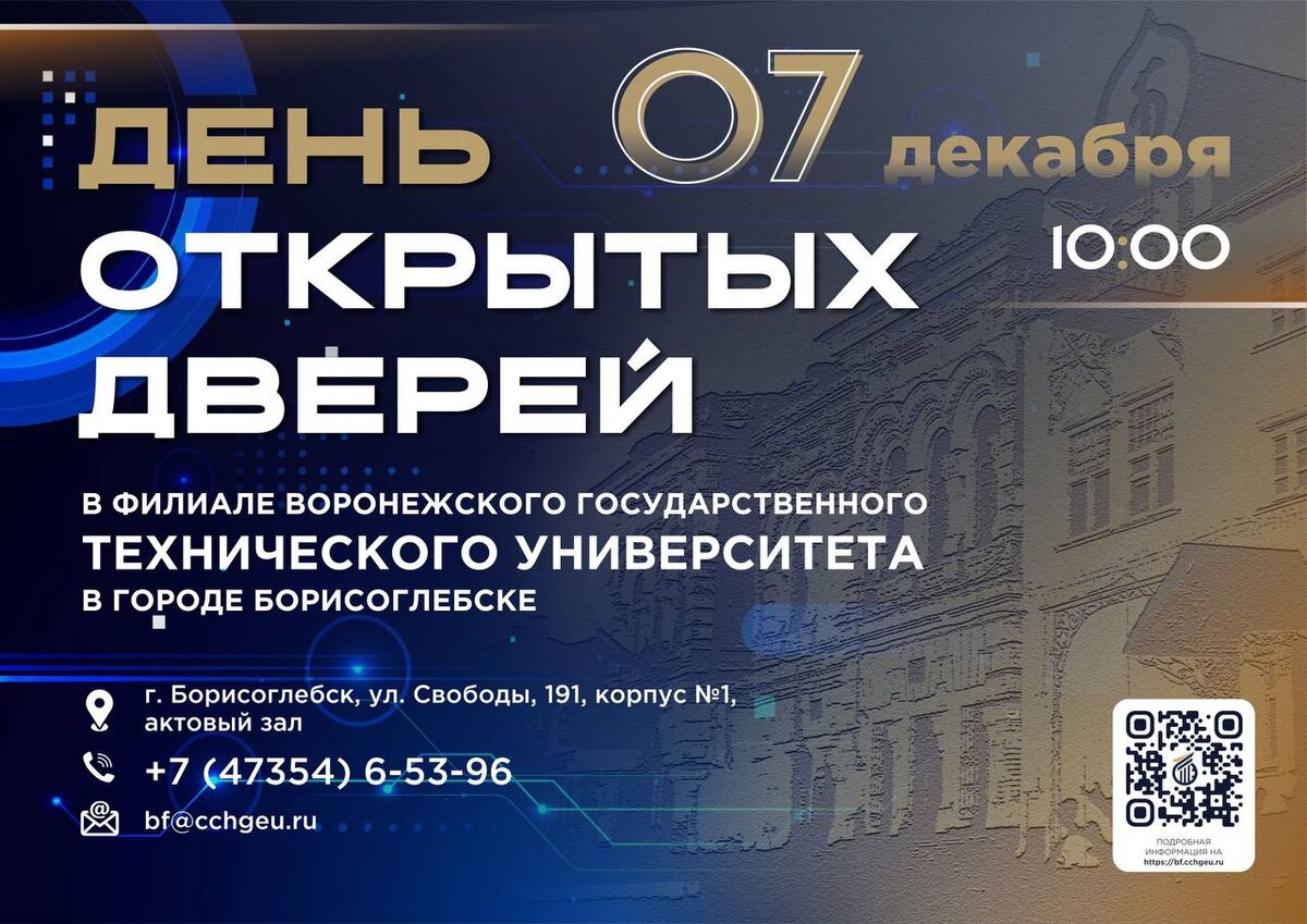 Уважаемые борисоглебцы и жители округа! 🎓 Филиал ВГТУ в Борисоглебске приглашает абитуриентов и их родителей на День открытых дверей! 📅 Когда? 7 декабря 2025 года в 10:00 📍 Где? ул. Свободы, 191 В программе: — знакомство с направлениями обучения; — встреча с преподавателями; — консультации по поступлению. 📞 Телефон для справок: +74735465396 Не упустите возможность узнать всё о качественном образовании в нашем городе!