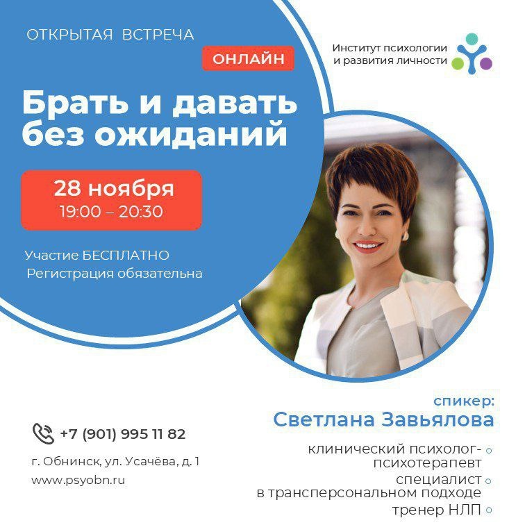 Институт психологии и развития личности приглашаем на открытую ОНЛАЙН встречу с психологом "Брать и давать без ожиданий