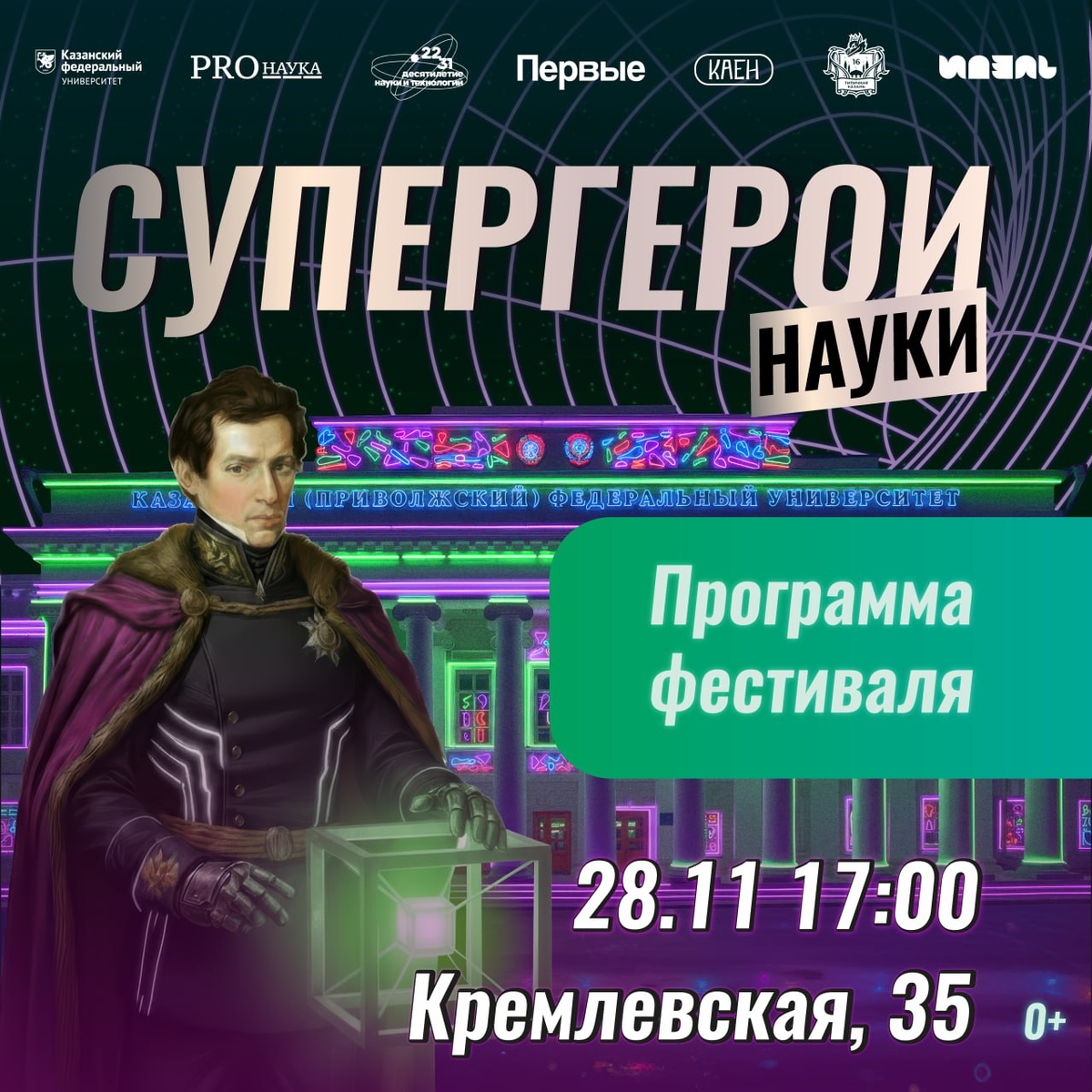⚡️Программа ХIX серии научно-популярного проекта «PROнаука в КФУ» Подготовили полную программу всех лекций, экскурсий, научных интерактивов и расписание научного шоу, которое пройдет на главной сцене мероприятия. Изучайте и сохраняйте, чтобы не пропустить ничего важного. Встретимся на «PROнауке» в Казанском федеральном. Будет супер 🤩 📆 28 ноября, 17:00 📍Казань, второй учебный корпус КФУ (ул. Кремлевская, 35) ❗️Количество мест ограничено. Обязательна регистрация. UPD: Регистрации на мероприятие закрыта. 📱Интересные места