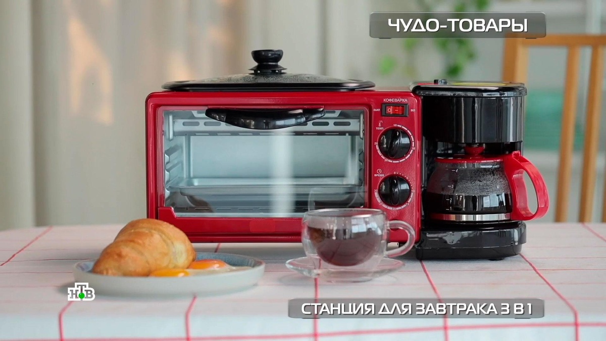 [ Смотреть видео на сайте НТВ ] Вкусный и разнообразный завтрак теперь можно приготовить проще. Для этого, как говорит реклама, нужна станция для завтрака 3 в 1. Программа «Чудо техники» решила проверить этот универсальный прибор ценой в 4,5 тысячи рублей. Что скажут обычные люди и профессионалы? Программа «Чудо техники» проверила в деле компактную станцию для завтрака. В ней — гриль с антипригарным покрытием для ароматной яичницы, духовка для хрустящего круассана и кофеварка капельного типа. Небольшое устройство поместится даже на самой скромной кухне, но при этом может готовить на целую семью, уверяет реклама. На популярном маркетплейсе у гаджета более полутора тысячи отзывов, и большинство из них — восторженные. В строящемся доме эксперта технадзора Антона Крюкова пока нет кухни. И ему, и его рабочим бывает сложно приготовить еду. Компактная станция могла бы стать решением. Антон приготовил несложный горячий перекус — хот-дог на скорую руку и кофе. Булочки отправились в духовку, сос