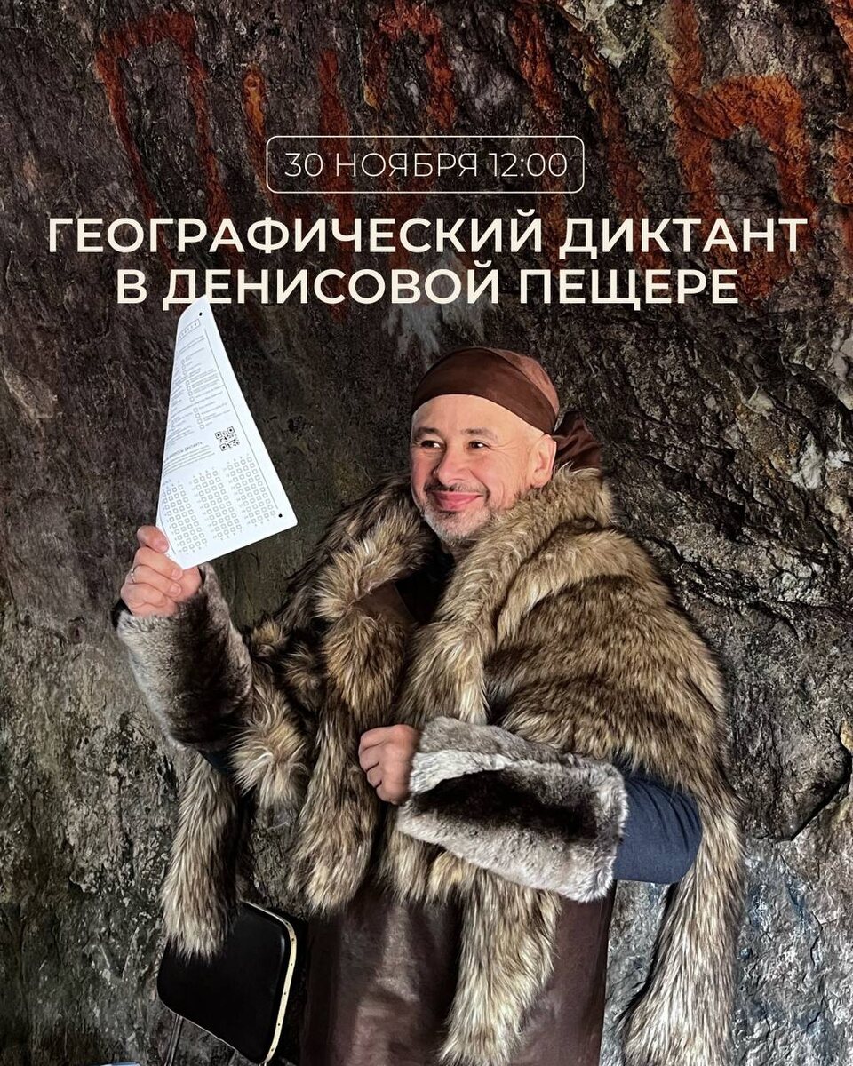 Для фонда «Денисова пещера» это уже третий год участия во всероссийской акции Русского географического общества. Атмосфера здесь всегда особенная: в прошлые годы диктант проводил член попечительского совета фонда Олег Акимов, который выходил к участникам в образе «денисовца». Где и когда: Денисова пещера, Алтайский край // 30 ноября, 12:00 Как принять участие: Географический диктант — это не экзамен, а возможность проверить себя, почувствовать масштаб страны и стать частью большого путешествия по России!
