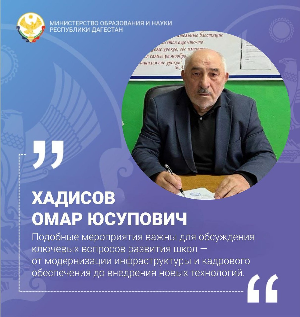 Руководитель Аргванинской СОШ Гумбетовского района — о прямой линии с Главой Республики Дагестан, которая состоится уже сегодня. Выражаю высокую заинтересованность в предстоящей прямой линии с Главой Республики Дагестан. Формат открытого диалога между руководством региона и жителями республики является важным инструментом для повышения прозрачности управленческих решений и укрепления доверия между обществом и органами власти. Для образовательного сообщества подобные мероприятия имеют особое значение. Они позволяют привлечь внимание к актуальным вопросам развития школ, модернизации инфраструктуры, обеспечению кадрового потенциала, внедрению современных образовательных технологий и созданию комфортных условий для обучения. Мы надеемся, что в ходе прямой линии будут затронуты темы поддержки сельских образовательных учреждений. Наша школа активно развивается, принимает участие в республиканских программах и инициативных проектах, направленных на улучшение образовательного процесса. Увер