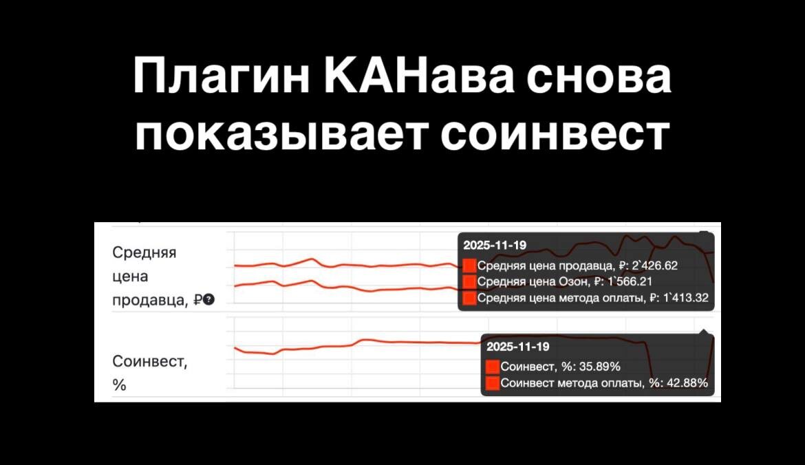 Спешим сообщить, что КАН снова собирает соинвест через плагин, вы уже можете видеть это обновление в личном кабинете. 12 ноября Озон перестал отдавать метрику по первому уровню соинвеста: это цена со скидкой площадки при оплате любыми доступными методами. Также у Озона есть второй уровень соинвеста, который работает при оплате Озон картой. На рынке по некоторым кабинетам порядка 75% всех оплат - это оплаты Озон картой. До 12 числа мы выводили соинвест первого уровня в автоматическом режиме, он накапливался в истории, и в КАНе можно было видеть, как вообще меняется площадка. Особенно это было актуально, когда Озон писал, что "мы снова поднимаем комиссии и в таком же точно размере компенсируем вам дополнительную скидку для покупателя". После 12 ноября Озон полностью скрыл соинвест, мы не видим его истории ❌ И мы доработали плагин, чтобы соинвест собирался плагином через кабинет. Это дало нам преимущество: теперь мы собираем цену по Озон карте💡 Плагин доступен для всех активных пользова
