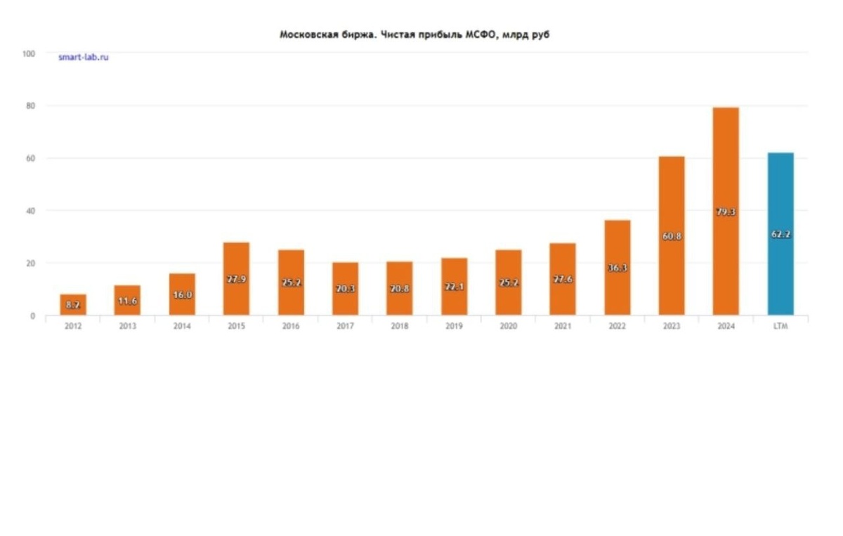 Мосбиржа Отчёт за 3 кв.25г. LTM (Last Twelve Months) в отчётности — это период последних 12 месяцев — Комиссионные доходы выросли на 30,75% по сравнению с аналогичным периодом прошлого года и составили ₽19,4 млрд на фоне высокой клиентской активности, а также в связи с запуском новых продуктов и услуг — Чистый процентный доход сократился на 44,3%, до ₽14 млрд — Операционные расходы сократились на 1,2%, до ₽11,3 млрд — EBITDA снизилась на 14,35%, до ₽25,3 млрд — Чистая прибыль г/г упала на 25% и составила ₽17,3 млрд, кв/кв рост на 12,7% (2 кв. 15 1 слрд руб.)