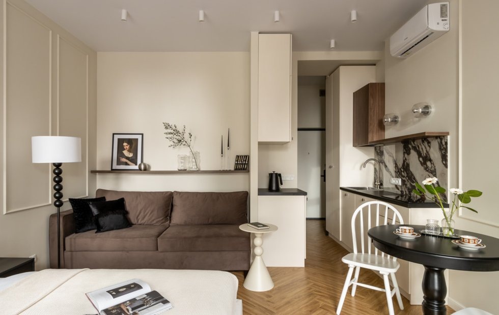 Эти апартаменты дизайнер Екатерина Шейн обустроила для сдачи в аренду гостям и жителям Санкт-Петербурга. Основное пожелание заказчицы заключалось в сохранении стены с оригинальной кирпичной кладкой. В процессе работы было важно правильно расположить необходимые для аренды элементы мебели, включая двуспальную кровать, дополнительное спальное место, предусмотреть хранение и кухню с необходимой техникой.