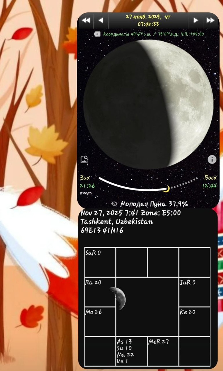 🍁🌜27.11.2025.🌛🍁 Ведическая Астрология Молодая Луна на границе Козерога и Водолея. РетроСатурн. РетроМеркурий. РетроЮпитер. ☕🌛 Луна понемногу выходит из тисков Козерога и вступает в знак свободолюбивого и немного хаотичного Водолея. С утра еще может ощущаться некоторое давление, но к полудню станет заметно легче. ⭐ 🌛Венера с Меркурием разжали пальцы рук и танец их в Весах распался. Она ушла в Скорпиона, а он всё пятится назад. Через несколько дней с Меркурия спадут чары ретроградности, он развернется и устремится вслед за Венерой, но так и останется на шаг позади. Во всяком случае, так картина складывается в этом году, и у них всё еще будет возможность встретиться, ведь они и мы- все ходим по кругу. 😭Прямо как в драматическом фильме: небесные сюжеты транслируют нам свои истории, и даже звезды порой роняют слёзы. ✨🌛 Но нам с вами нельзя терять оптимизма! Даже сквозь слёзы и нахлынувшую печаль важно постараться наполнить мысли чем-то светлым — а оно, без сомнения, есть. 💗Пр