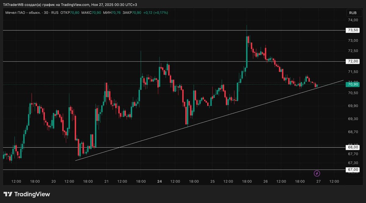 Сегодня планирую работать с: $MTLR Планирую присмотреть шорт на отскок от 72. (Вход могу взять в диапазоне 71,72 - 72) ❌ Стоп поставлю 0,5%. Тейк +1-1,5%. При достижении +0,5% поставлю стоп в без убыток. Больше идей в Базе. Это условие торговли, то есть если будет вход, зайду. Не будет входа, НЕ зайду. Если Мечел уйдет ниже 70 - идея не актуальна. Да будет прибыль сегодня! 🤝 Мечел не актуален