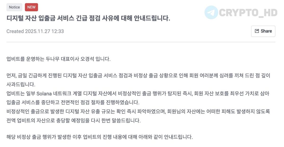 #взлом ❌ Биржу Upbit взломали на $36,000,000. Крупнейшая корейская криптобиржа Upbit сообщила о взломе в сети Solana. Хакеры вывели активы на сумму около 540b KRW – ($36m). В Upbit заявили, что все клиентские убытки будут полностью компенсированы за счет собственных резервов биржи. Crypto Headlines