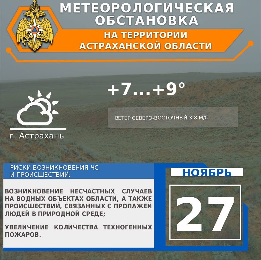 🍂Метеорологическая обстановка на 27 ноября На территории области переменная облачность⛅️. Без существенных осадков. Ветер восточной четверти 💨3-8 м/с. Температура воздуха днем +5...+10°, ночью -5...0°.🌡 . По г. Астрахань переменная облачность🌤. Без существенных осадков. Ветер северо-восточный 💨3-8 м/с. Температура воздуха днем +7...+9°, ночью -2...+0°🌡. ✅Присоединяйся к МЧС Астрахань ⏩Подписывайся на МЧС России в MAX | ВК