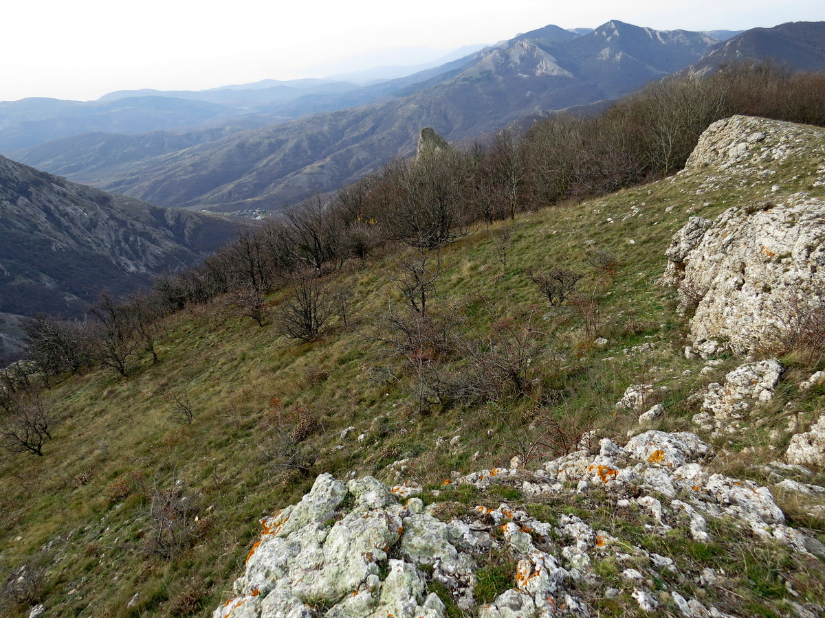 Вели мы своих друзей немного дальше, чем перевал Горуча. Справа от нас находится гора Кокташ. Такое название, обозначающее Синий камень, у нас встречается часто. Когда здесь стоишь, кажется, что дальше уже не пройти, там за деревьями ничего нет. Но, это не так! Именно там и находится то самое тайное место, куда мы и ведем своих друзей! Тропа идет среди сказочно заросших мхами деревьев, по склону огромного ущелья. Откуда все это появляется даже и не понятно! И вот мы выходим из зарослей и перед нами открывается довольно крутой склон, уходящий в ущелье, с одной стороны, а с другой ограниченный крутым скальным обрывом. Это гора Кыз-Кая. По самому верху идет узенькая тропа. Когда мы пришли с Мишей сюда первый раз, я даже боялась смотреть по сторонам, все время держалась за руку. Вторая встреча с горой проходит, как уже со старой знакомой! Виктор, завидя незнакомые скалы, уже умчался вперед! Татьяна просто идет, впитывая в себя эту красоту. Мы уже пришли к цели своей прогулки. Можно