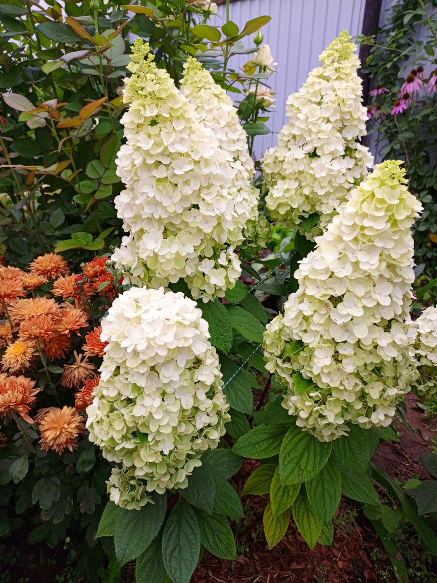 Всем доброе утро ❤ Сегодня на обзоре гортензия Мэджикл Килиманджаро. Меня она покорила своими соцветиями такими ровными , острыми , четкими, действительно как пики гор. Это гортензия из тех , что не переходит в темно бордовые оттенки. Она белая и в конце лета зеленеет. Слегка розовое появляется уже в сентябре. Последние два фото это двадцатые числа сентября этого года. Из всех моих гортензий она больше всего хлорозит . При посадке ей нужно добавить кислого торфа в яму . Ну а если захлорозит , то обработать препаратами железа