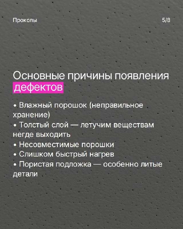 Проколы в порошковом покрытии В картинках вся информация о проколах и как их возникновение не допускать, а в жизни чаще всего причинами дефекта являются: 1. Несовместимость красок 2. Газящий алюминий 3. Превышение максимального слоя покрытия #дефекты