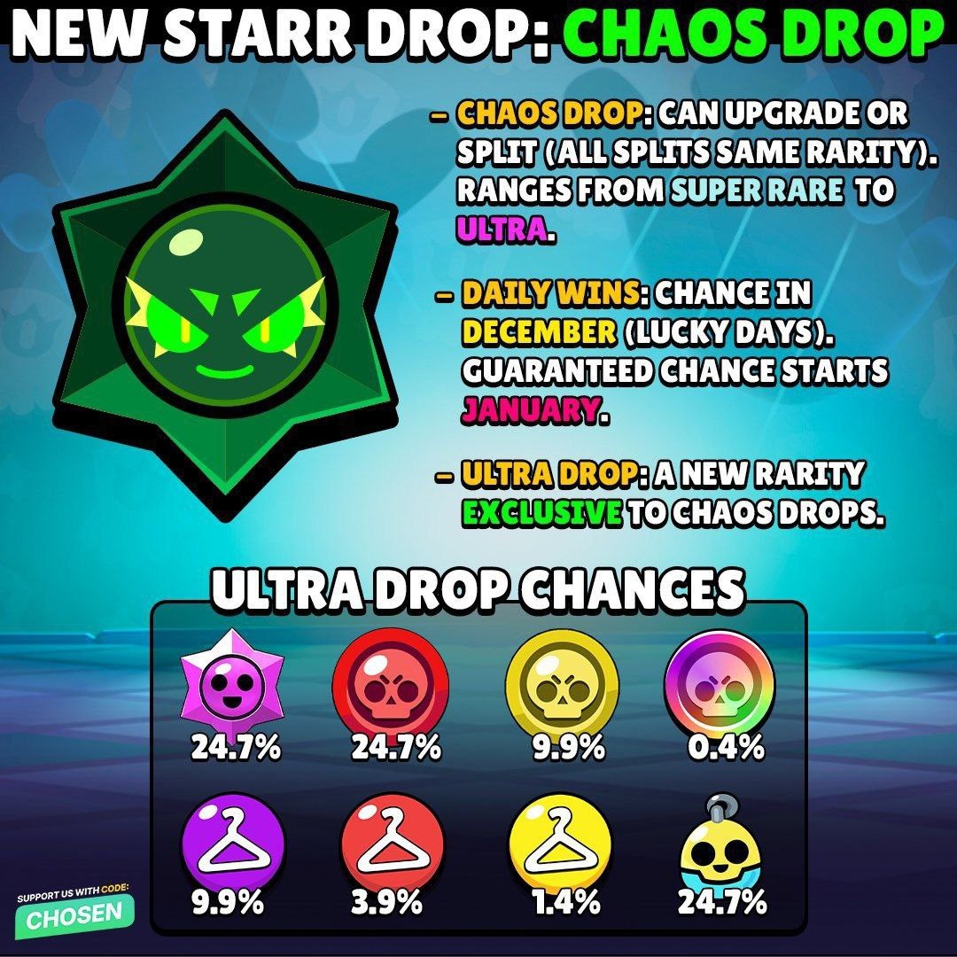 😄 Новый старр дроп Хаос дроп — новый вид старр дропов. Он может повышать редкость, а также разделяться, как суши. Все части дропа будут иметь одну редкость, от суперредкой до новой ультралегендарной редкости. С него могут выпасть бравлеры, гиперзаряды, скины и баффи. Может выпасть даже ультралегендарный персонаж. Хаос дроп выйдет уже в декабре в счастливые дни, а в январе его можно будет получать и в обычные дни. А также он будет в дополнительных наградах после прохождения Brawl Pass, о них мы поговорим в следующем посте. ✅Новости по Clash Royale - ТЫК ✅Новости по Телеграмм подаркам, NFT - ТЫК Мир Supercell. Подписаться