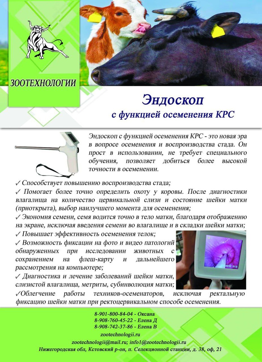 Эндоскоп - видеть и знать👍 Прибор с визоцервикальным методом осеменения является современным модифицированным и усовершенствованным инструментом для осеменения самок КРС. Он прост в использовании, не требует специального обучения, позволяет добиться более высокой точности, чем при традиционном осеменении. Прибор позволяет: ✔️ Комфортно провести вагинальный осмотр животного на предмет готовности к осеменению и выявлению патологий. ✔️ Безопасно произвести осеменение самки КРС визоцервикальным методом. ✔️ Эффективно произвести вагинальное лечение лекарственными средствами, через канал зонда прибора. Эндоскоп с функцией осеменения – это новый прибор для вагинального осмотра животного и диагностики заболеваний. Прибор позволяет проводить осеменение животных. Эндоскоп с функцией осеменения является простым и необходимым аппаратом в руках ветеринарного врача, зоотехника, осеменатора, помогающий в повседневной жизни Все вопросы Вы можете задать по телефонам: Елена Д.: 8