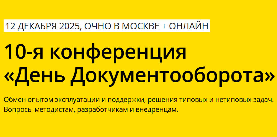 Уважаемые коллеги и партнёры, совместно с фирмой 1С приглашаем вас принять участие в Конференции «День Документооборота», посвященной практике применения решений «1С» для автоматизации документооборота. Целью Конференции является обмен опытом внедрения и эксплуатации решений «1С:Документооборот», «1С:Архив», «1С-ЭДО», «1С:Документооборот Холдинга», «1С:EDI» для предприятий и учреждений, представление новых возможностей этих решений и платформы «1С:Предприятие».