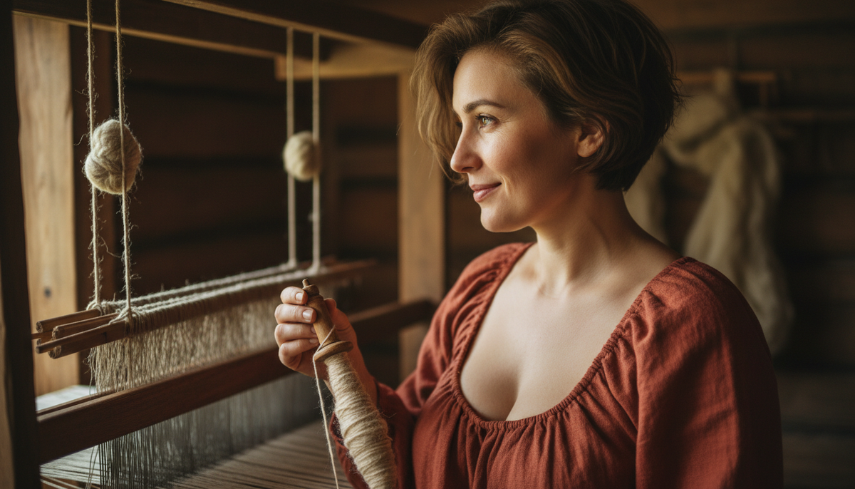 Анастасия идёт по лугу на рассвете, коса в руках ложится ритмично, трава падает волнами под лезвием, а солнце золотит её волосы, развеянные ветром с реки, — простота в этом движении, где пот блестит на шее, как роса, а плечи гнутся грациозно, без ропота. Она не останавливается: шаг за шагом, охапка за охапкой, и в глазах — та ясность, что рождается от земли, от простоты косы, что режет не злобно, а чисто, оставляя луг ровным, как полотно.