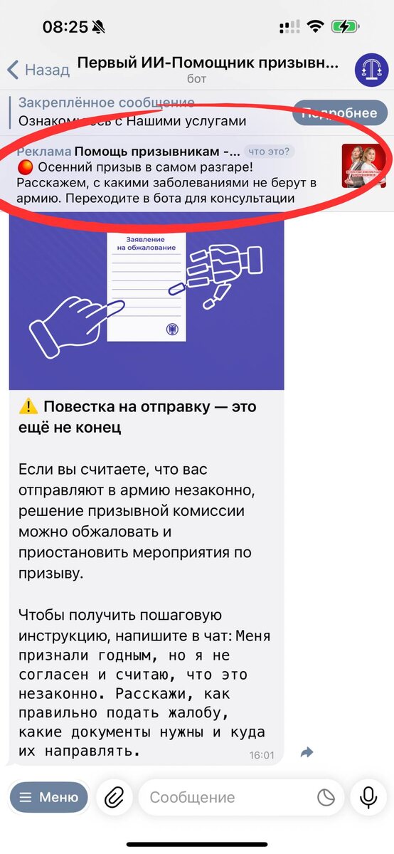 ⚠️ Это не наше объявление! Друзья, будьте внимательны: Telegram Ads позволяет размещать рекламу внутри ИИ-Помощника. И, как оказалось, эту функцию можно использовать не совсем добросовестно: в одном из объявлений «конкуренты» использовали наше название и приглашают пользователей Помощника к себе на консультации. К сожалению, убрать рекламу в боте пока невозможно, но мы над этим работаем. А пока, пожалуйста, будьте внимательны: обратите внимание на то, что на этом сообщении висит плашка «реклама» и что его авторы – другая компания. Если вы переходите по этому баннеру, вы обращаетесь не ко мне ⛔️ Мой контакт для связи всегда — @Voennik_365