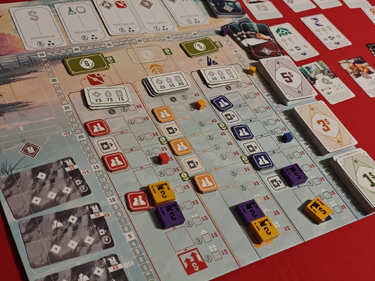 Доброго денечка, дамы и господа! Вчера с Вадимом решили поиграть в настолочки. Я ему хотел показать Солтон-Си, а он хотел сыграть в Батлкон. В итоге решили и в то и в другое. В этом посте расскажу про Солтон-Си, про Батлкон расскажу чуть позже, чтобы не мучать вас долгим чтивом) Я уже писал мини-обзор и впечатления после первой партии. Если вкратце, мне игра еще тогда понравилась. Вчера же мы затестили ее на двоих. Если вы не знаете, о чем игра, можно почитать здесь: Вадим хорошо понял правила, с этим проблем не было. Но как обычно бывает в таких играх: знаешь правила, но не знаешь, с чего начать и в какую сторону двигаться. Признаться, у меня в процессе партии тоже была эта проблема. Вроде, хочется сделать все, но рабочих не хватает. Но теперь хотя бы не такие проблемы с деньгами были, как в первой партии. У Вадима был дефицит всего в начале партии, но уже к середине все пошло как по маслу. У меня же наоборот начало пошло очень и очень бодро, а вот под конец как-то сдулось все. Вес