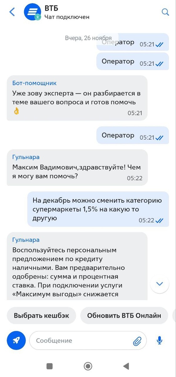 Хочу показать наглядно историю, почему я так "амбасадорю" Т Банк. У меня произошла ситуация в ВТБ. ВТБ активно предлагал перейти из почта Банка (перевести карту почта Банка в ВТБ. За это пообещал дать 7% категорию на супермаркеты. (Как дополнительную) 26.11.25 ВТБ предложил выбрать 4 категории кешбека (я зарплатный клиент поэтому 4). Одна из категорий была "супермаркеты 1,5%" - я выбрал еë тоже. При этом у меня отдельной строкой высветилось, что мне дадут кешбек 7% супермаркеты за переход из Поста Банка. Никакой информации о том что категории не суммируются - не было. В моей голове это так: 1,5%+7% = 8,5% В конечном итоге, после того как я полез проверять категории 1,5% - просто пропало, и высветилось 7%. Я подумал ладно, заменю категорию через чат (которая была выбрана 1,5% и куда-то просто исчезла. В чате я сначала получил от оператора набор ненужной информации. Потом и вовсе - ответ "ничего поменять нельзя". Потом оператор долго не могла понять о какой категории за пе