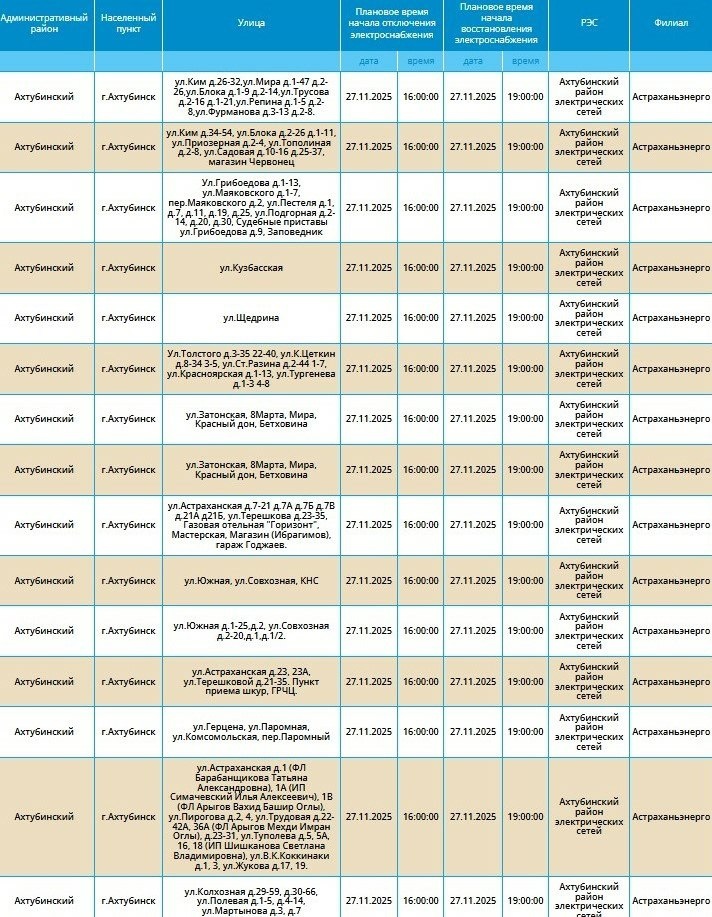 Массовое отключение света🙄 Сегодня, 27 ноября, с 16:00 десятки улиц Ахтубинска и поселений района останутся без электричества. В ресурсоснабжающей организации пояснили, что отключения связаны с проведением плановых технических работ, на которые понадобится три часа. 📌В числе «счастливчиков» - Успенка, Батаевка, Ново-Николаевка, Болхуны, Пироговка, Золотуха, Сокрутовка, Удачное и следующие адреса районного центра ⬆️⬆️⬆️ 😒П.с некоторые жители района сегодня без света также с 8 утра.