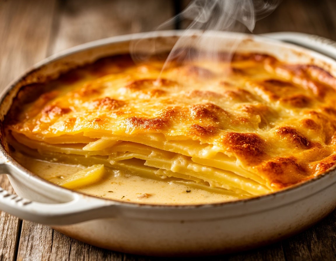 Это французский рецепт — нежнейшая, тающая во рту запеканка. Внешне она выглядит как румяная шапка, а внутри — сочный, сливочный, ароматный картофель.