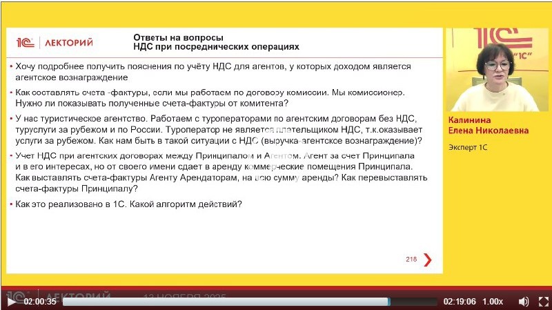 ⁉️ НДС при посреднических операциях ▫️Хочу подробнее получить пояснения по учёту НДС для агентов, у которых доходом является агентское вознаграждение ▫️Как составлять счета -фактуры, если мы работаем по договору комиссии. Мы комиссионер. Нужно ли показывать полученные счета-фактуры от комитента? ▫️У нас туристическое агентство. Работаем с туроператорами по агентским договорам без НДС, туруслуги за рубежом и по России. Туроператор не является плательщиком НДС, т.к.оказывает услуги за рубежом. Как нам быть в такой ситуации с НДС (выручка-агентское вознаграждение)? ▫️Учет НДС при агентских договорах между Принципалом и Агентом. Агент за счет Принципала и в его интересах, но от своего имени сдает в аренду коммерческие помещения Принципала. Как выставлять счета-фактуры Агенту Арендаторам, на всю сумму аренды? Как перевыставлять счета-фактуры Принципалу? ▫️Как это реализовано в 1С. Какой алгоритм действий? на эти вопросы ответила Елена Калинина, эксперт 1С в лекции на тему УСН: кто будет п