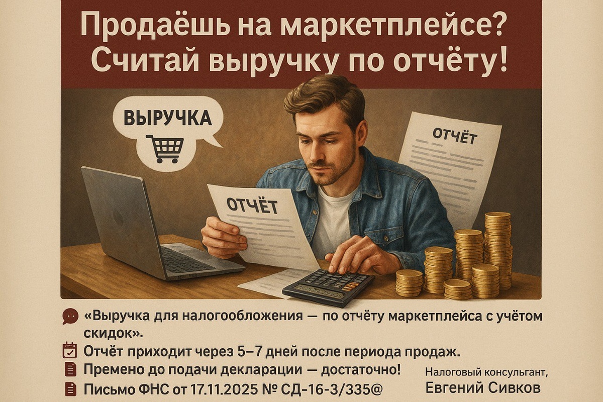 📦 Маркетплейс ≠ путаница: как считать выручку для налога? ФНС разъяснила, как продавцам на маркетплейсах правильно определить выручку для налогообложения, если размер скидок становится известен только из отчёта маркетплейса. 📃 В письме от 17.11.2025 № СД-16-3/335@ ФНС ссылается на: — ст. 999 и 1008 ГК РФ — об отчётности агента и комиссионера; — практику оферт маркетплейсов, которые высылают отчёты в течение 5–7 дней после периода продаж. 📆 Учитывая, что декларации по налогам подаются до 25-го числа следующего месяца, у продавцов есть время, чтобы дождаться отчёта, учесть скидки и сформировать налоговую базу корректно. 🧾 Считаем не по отгрузке, а по фактическим данным из отчёта маркетплейса. 📌 Главное: формируй выручку на основе отчёта, а не предварительных данных. #маркетплейс #ФНС #письмоФНС #налоговаябаза #НДС #УСН #скидки #выручка #бизнесонлайн #wildberries #ozon #агентскийдоговор #налоги2025