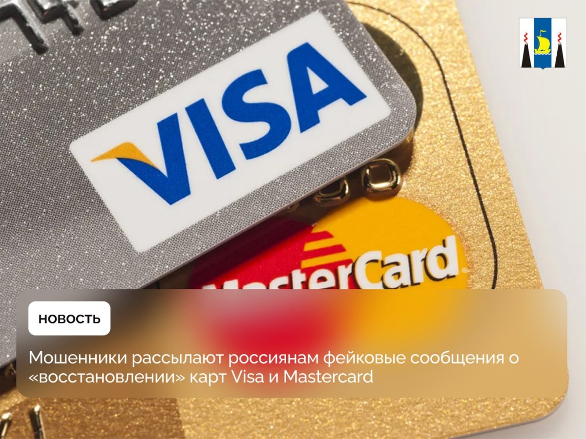 Новый вид кибермошенничества Мошенники рассылают россиянам фейковые сообщения о «восстановлении» карт Visa и Mastercard, заманивая пользователей на поддельный сайт банка для ввода данных Но международные платёжные системы в России не работают, и никакого восстановления не происходит. Перейдя по ссылке, жертва теряет свои данные и деньги.