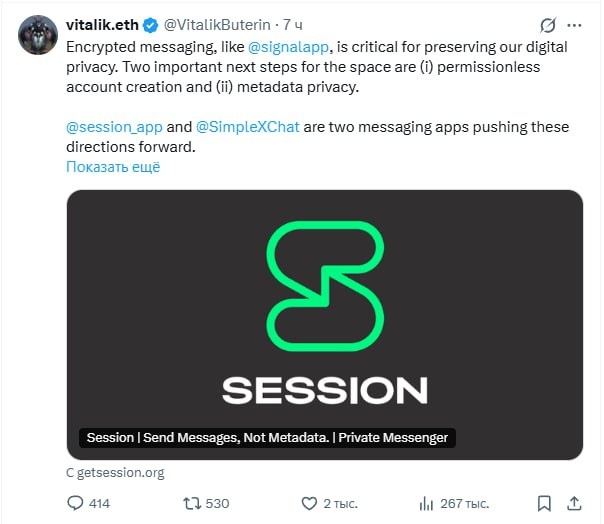 Зашифрованные мессенджеры, такие как @signalapp, крайне важны для защиты нашей цифровой приватности. Два важных следующих шага в этой сфере — это (i) создание аккаунта без разрешения (permissionless) и (ii) конфиденциальность метаданных. @session_app и @SimpleXChat — это два мессенджера, которые развивают эти направления. По этой причине я пожертвовал по 128 ETH каждому из них. Адреса для проверки доступны на их сайтах, если хотите последовать моему примеру: https://getsession.org https://simplex.chat Но также — просто скачайте и используйте их! Оба приложения пока не являются идеальным программным обеспечением, им еще предстоит пройти путь до по-настоящему оптимального пользовательского опыта и безопасности. Сильная конфиденциальность метаданных требует децентрализации, а децентрализация — это сложно. Ожидания пользователей поддержки нескольких устройств еще больше усложняют все. Устойчивость к Sybil-атакам и DoS как в сети маршрутизации сообщений, так и на стороне пользователя (