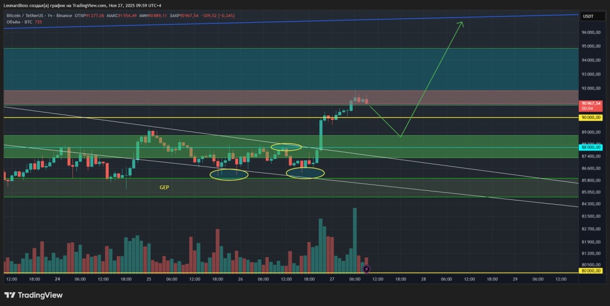 В ответ на пост #мнениепорынку 🕯🕯🕯 ⚠️Итак, коллеги, продолжаем наблюдать отработку сценария, даже хочется назвать словом "идеально"), хотя, как мы знаем ничего идеального не бывает, иначе к чему тогда стремиться?? Тем не менее, и повторный ретест зоны блока увидели, и выход в зону уровней 90-92К также увидели = факт!! ⚠️Продолжаю показывать вам оба графика, что вы смогли убедиться в правильности моих мыслей, где я заострял внимание на периодическое появление объемом именно по графику СМЕ. И в очередной раз мы можем констатировать данный факт, где крайний рост также сопровождался мощными объемами!! ⚠️И да, крайнее локальное движение также сопровождается объемами на Binance = подключилась розница! Что дальше?? Прямо сейчас просится откат в зону уровня 89К, чтобы закрыть образовавшуюся локальную дыру, после чего можно спокойно отправляться выше, плюс этим движением будут сброшены очередные лонговые (свежие) плечи!! ⚠️Но, да именно НО в текущей ситуации: крайняя 4Н свеча закрылась о