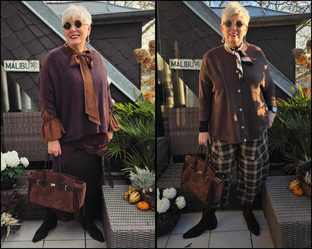 Всем привет! Благодарю, что заглянули на канал Рубрика: мода и стиль На канале 👉ТГ👈 много интересных подборок🔥 Многие зрелые женщины по‑прежнему считают, что стильная одежда - это прерогатива молодых и стройных, хотя современная мода давно стала инклюзивной и подходит людям любого возраста и телосложения. Личное чувство стиля формируется не цифрами на ценнике, а умением подбирать вещи, которые подчёркивают индивидуальность. Немецкий фэшн-блогер Петра Мюллер (Petra Möller) на собственном примере показывает, что мода может быть вдохновляющей и в больших размерах, напоминая аудитории, что стиль - это про уверенность, а не про рамки. Давайте же посмотрим, как и с чем она предлагает носить разные оттенки трендового (но уже изрядно поднадоевшего) коричневого цвета. Хочется отметить, что Петра часто комбинирует одни и те же вещи в разных ансамблях. Объемный коричневый тонкий кардиган можно носить с чёрными кожаными брюками, чёрными ботинками, гармонирующей с цветовой палитрой замшевой сум