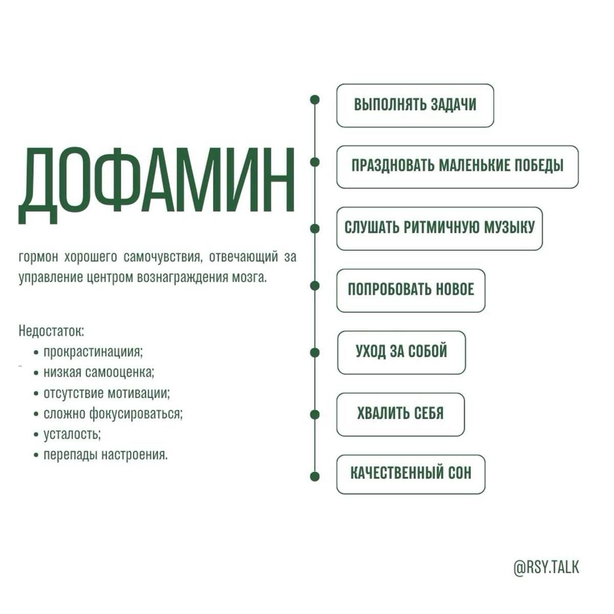 Дофамин: гормон «предвкушения» и мотивации 🦋 Всем привет! Продолжаем разговор о гормонах. Сегодня на сцене — ДОФАМИН (или допамин, как его еще называют). Простыми словами, дофамин — это важный нейромедиатор, который работает как внутренняя система вознаграждения нашего мозга. Если серотонин — это гормон радости, то дофамин — это гормон «Я молодец!» и «А что будет дальше?» 😉 Когда мы его чувствуем? Он включается, когда мы: ❤️ Испытываем влечение к кому-то. 🍕 Едим любимую еду (особенно что-то вкусненькое и желанное). 🎁 Думаем о предстоящей приятной встрече, покупке или путешествии. Знакомое чувство «бабочек в животе», волнение и предвкушение — это как раз он! Самое интересное! Раньше дофамин считали «гормоном удовольствия», но последние исследования показали кое-что более важное. Он связан не столько с самим удовольствием, сколько с его ОЖИДАНИЕМ. Именно дофамин заставляет нас хотеть, стремиться и искать «награду». Он — наш главный мотиватор! За что он еще отвечает? · Обу