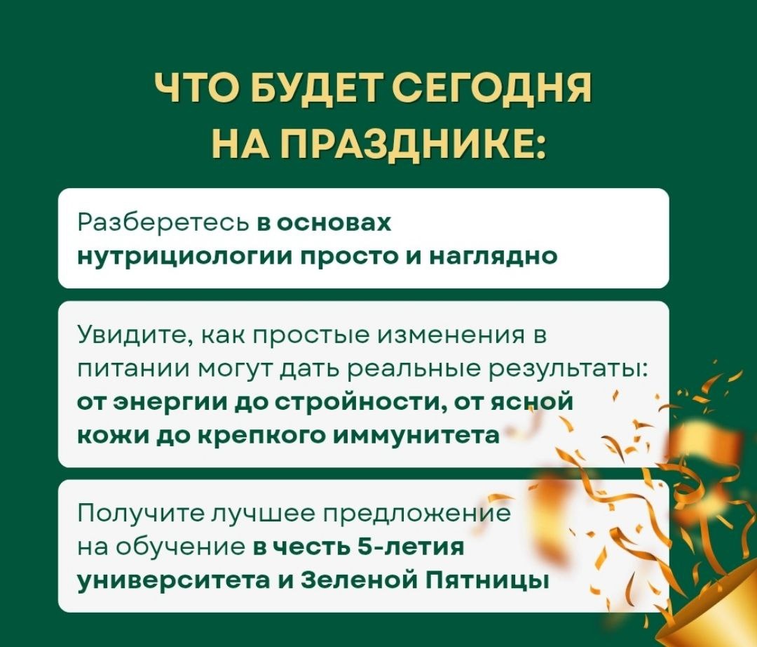 Дорогие мои, уже совсем скоро мы с вами встретимся на нашем двойном празднике: день рождения МУИНФМ и Зелёной пятнице! 🥳 Мы все уже на низком старте, в предвкушении нашей онлайн-вечеринки🎉 Мы с вами немного понастальгируем: вспомним, как вообще появился наш университет нутрициологи, посмотрим его изнанку, поделимся достижениями. 📌Также вы узнаете, что вообще такое нутрициология, с какими проблемами она может помочь и каким образом помогает. Ну и конечно же, сегодня вы получите эксклюзивное предложение, которого больше не будет! Только сегодня и завтра вы сможете поступить в МУИНФМ на самых выгодных условиях. Такое точно нельзя пропускать! Регистрируйтесь на эфир, и до встречи через 2,5 часа 👇 https://clck.ru/3QXm8v