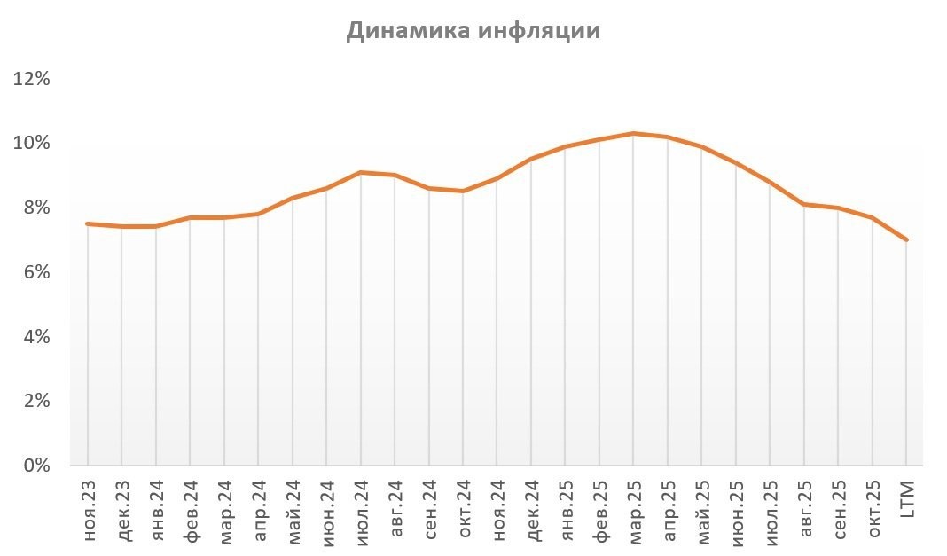 📊 Индекс МосБиржи продолжает консолидироваться в районе 2700 пунктов в ожидании конкретики по переговорному треку. Пока же в западных деловых СМИ много информационного шума, а детали, вероятно, станут известны лишь на будущей неделе, когда состоится встреча российского президента со спецпосланником США Стивом Уиткоффом 📉 Росстат сообщил о снижении инфляции с 7,2% до 7% по состоянию на 24 ноября. Это минимальный показатель за последние два года. Учитывая эффект высокой базы, когда в конце прошлого года инфляция резко ускорилась, в декабре показатель может опуститься ниже 7%. Это открывает перед Центробанком возможность для очередного снижения ключевой ставки на заседании 19 декабря. 💻 Диасофт представил отчётность за шесть месяцев 2025 финансового года, сообщив о сокращении выручки на 4,8% до 3,9 млрд рублей и падении чистой прибыли на 87% до 91 млн рублей. Слабые результаты были ожидаемыми, так как заказчики сокращают бюджеты на IT-инфраструктуру в условиях жёсткой ДКП. Прогнозы мен