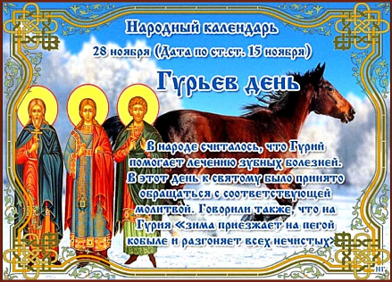 В пятницу, 28 ноября Православной церковью отмечается память святых Гурия, Самона и Авива, живших в III-IV веках и считающихся христианскими святыми, мучениками и исповедниками. ❇️ПРИМЕТЫ ✔️Если снег в этот день выпал, то, согласно приметам, пролежит до весны. ✔️Много снега – к хорошему урожаю. ✔️Если в этот день дует сильный ветер, то ветреная погода будет до Дня Святого Николая (19 декабря). ✔️Если лошади громко ржут, то это хороший знак. Зима будет теплой и мягкой. ✔️За окном тепло и идёт дождь или мокрый снег – май будет холодным и ненастным. ✔️Если в этот день мороз, то нечисть исчезнет и до Святок не будет честной народ тревожить. ✔️Женщине, чей муж злой и непокладистый, в этот день нужно помолиться Гурию и тогда супруг подобреет. ❌ЧТО НЕЛЬЗЯ ДЕЛАТЬ ✔️Нельзя в Гурьев день ложиться спать, не приняв горячую ванну, или же не сходив в баню. Тот, кто ослушается запрета, весь год будет маяться лихорадками. Если же хорошо попариться в этот день и при этом попросить о здоровье, то