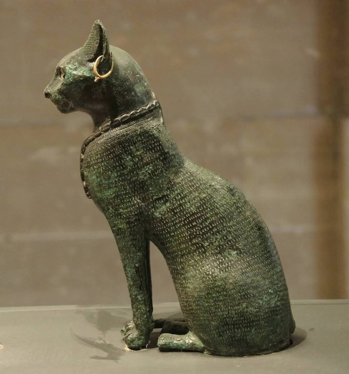 Бронзовая Бастет с позолоченными глазами. Лувр, поздний период Египта (664–332 до н. э.) Перед вами - крошечная, но невероятно утончённая статуэтка богини Бастет, созданная мастерами позднего Египта. Всего 14 сантиметров высоты - и целая вселенная символов, верований и древнего мастерства. Бастет изображена в своём привычном кошачьем облике: она сидит с царственной грацией, словно слышит музыку храмов. Её глаза - инкрустация из золота, сверкающая даже спустя 2500 лет. На ушах - серьги, на шее - широкое ожерелье, усыпанное амулетами: 🐚 ракушки каури - символ плодородия, 🪲 скарабей - знак возрождения и божественной защиты. Особая деталь скрыта в центре нагрудного украшения: миниатюрная львиная богиня, сидящая на лотосе. Так мастера соединили обе сущности Бастет - мягкую защитницу дома и детей и грозную львицу, способную обернуться мстительницей богов. Отлитая из медного сплава и украшенная позолотой, статуэтка отражает высокий уровень ремесла позднего периода, когда подобные изобр