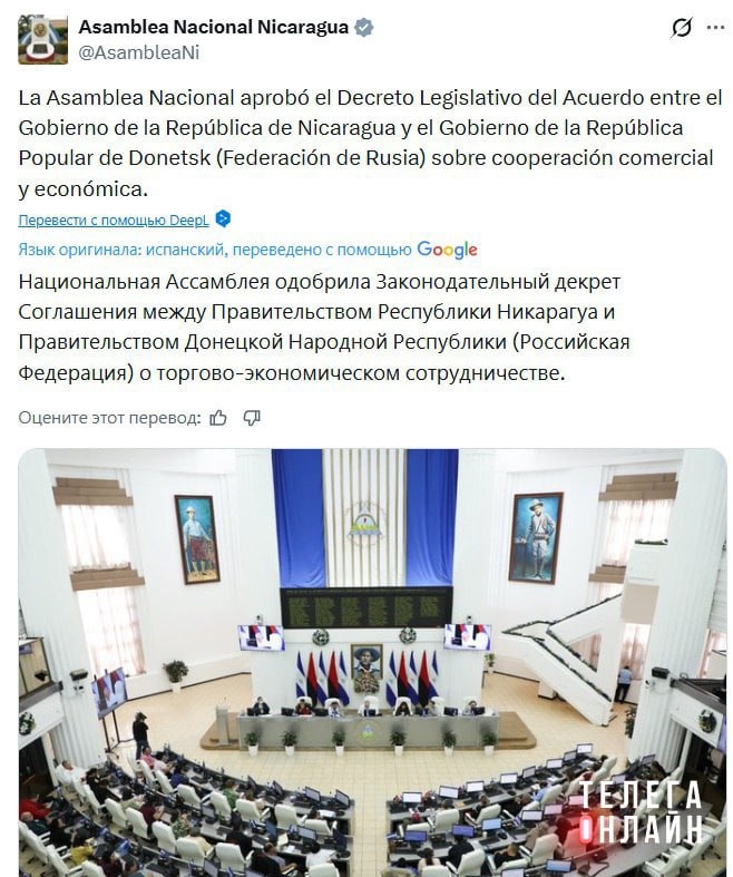 Парламент Никарагуа одобрил соглашение об установлении торговых отношений с Донецком и Севастополем. Манагуа впереди планеты всей. #этимвсесказано 🚲 Подпишись на Телега Online