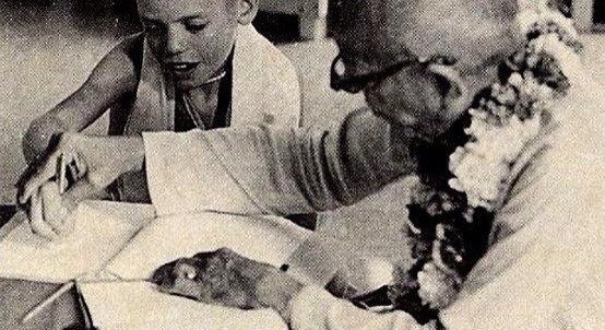 Помимо традиционных лекций и рекомендаций для учителей гурукулы, он также провел вводный урок санскрита для детей. На этой фотографии мальчик по имени Баларам рисует первые в своей жизни иероглифы деванагари. Этот мальчик – сын Ватсалы Прабху, ученика Шрилы Прабхупады. Позже повзрослев, он получил харинама-дикшу и имя – Дваракадхиш Дас.Вспоминая тот визит Шрилы Прабхупады в гурукулу, Дваракадхиш Прабху рассказывает о том, как однажды Прабхупада попросил всех учителей выйти из комнаты и плотно закрыть за собой дверь.