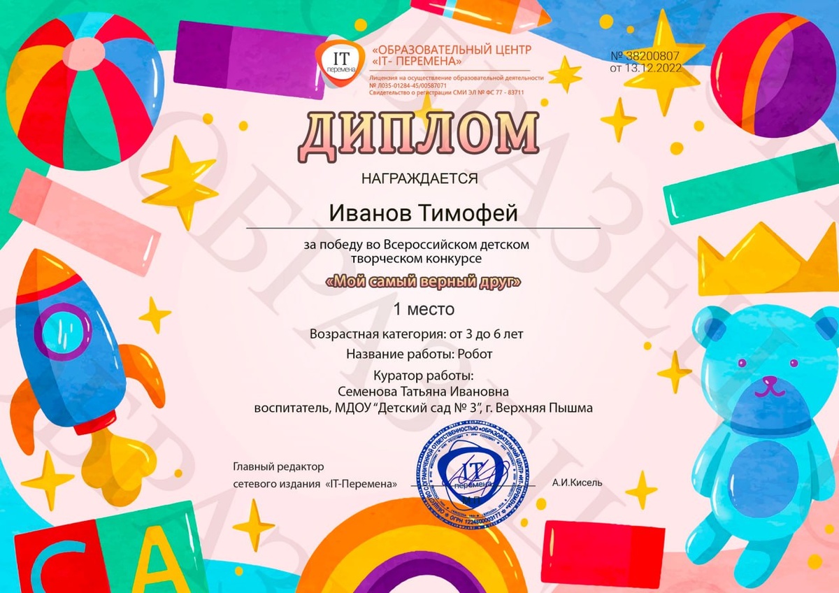 Мы подвели итоги бесплатного Всероссийского детского творческого конкурса "Мой самый верный друг"! Результаты и наградные документы уже размещены в нашем новом поисковом телеграм-боте "Переменка": https://t.me/itperemenka_bot На сайте на странице результатов итоги будут опубликованы 1 декабря в 8:00 по МСК. Заказать оригиналы наградных документов, напечатанных в высоком качестве на плотной бумаге, можно под соответствующим дипломом.