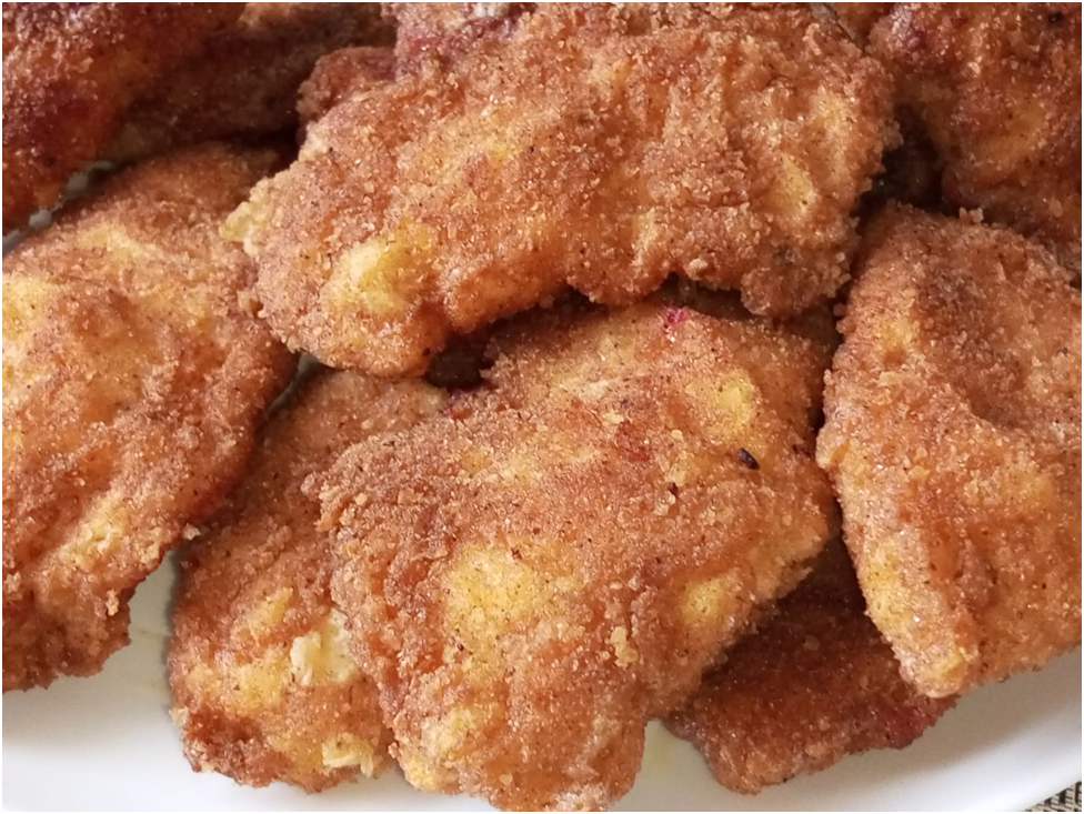 Такие куриные грудки готовлю часто, а особенно когда в доме собирается много детей. Дети от таких грудок в полном восторге, да и приготовить совсем несложно. Из 3 куриных грудок получается много, но очень быстро исчезает со стола. Ингредиенты: - куриные грудки – 3 штуки; - яйца – 2-3 штуку; - мука – 3 столовые ложки; - панировочные сухари – 80-100 гр.; - соль – по вкусу; - паприка молотая – 1 чайная ложка; - смесь черного молотого перца и сушеного чеснока – 0,5 чайной ложки; - растительное масло для жарки. Сушеный чеснок отдельно от черного молотого перца использовать не советую, по какой-то причине чеснок пригорает. Куриные грудки промыть, нарезать вдоль на кусочки как на фото, толщиной примерно 0,5 см. и шириной от 3 см. до 5 см., как получится, на результат готовых грудок не влияет. Нарезанные куриные грудки посолить с обеих сторон. В глубокой емкости вилкой взбить яйца. В другую емкость добавить муки. В третью емкость добавить сухари, к сухарям добавить паприку, смесь перца с чесно