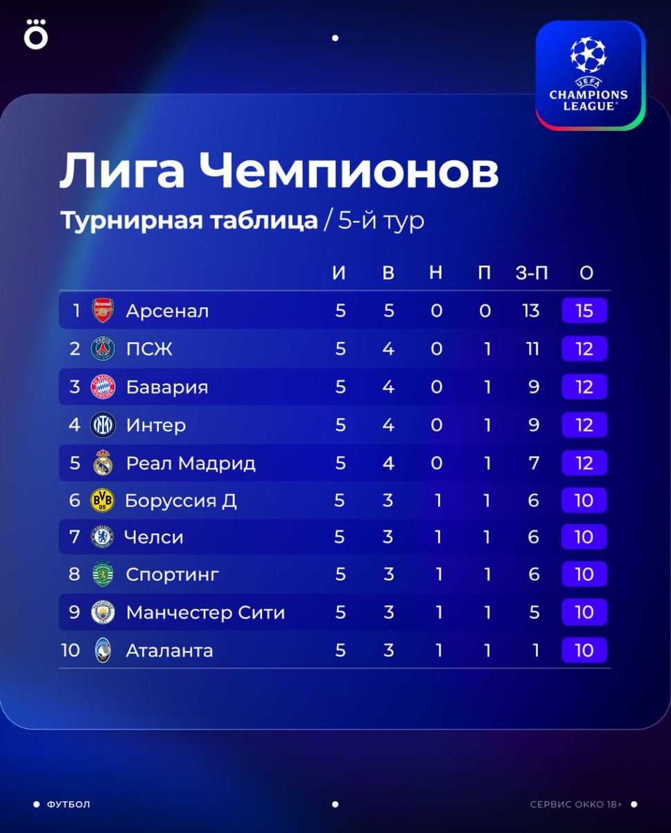 В топ-5 ЛЧ — ровно по одной команде из топ-5 лиг Европы. Ну а лондонский «Арсенал» уверенно заправляет всем этим делом 🏆 На каком месте находится твоя любимая команда после 5 туров? 👀