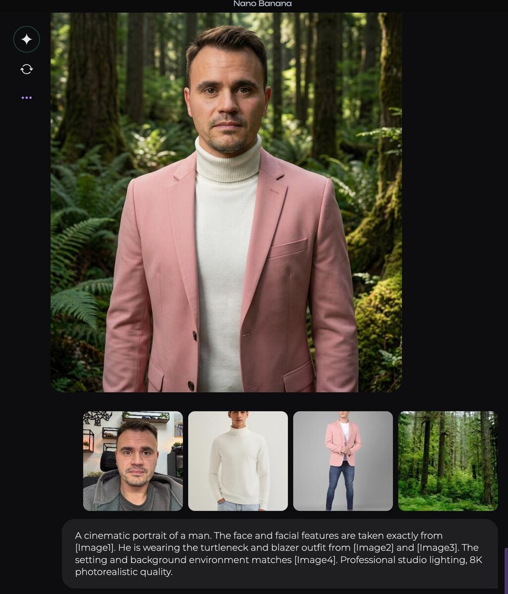 Собираем образ из нескольких фото На 1 промпт реакций собрали 💪 В Nano Banana можно на базе нескольких фотографий соединить человека с одеждой и окружением. A cinematic portrait of a man. The face and facial features are taken exactly from [Image1]. He is wearing the turtleneck and blazer outfit from [Image2] and [Image3]. The setting and background environment matches [Image4]. Professional studio lighting, 8K photorealistic quality. Цвет одежды с референса можно менять: A cinematic portrait of a man. The face and facial features are taken exactly from [Image1]. He is wearing the yellow turtleneck and blue blazer outfit from [Image2] and [Image3]. The setting and background environment matches [Image4]. Professional studio lighting, 8K photorealistic quality. Вариант применения: изначально перед заказом одежды примерить её. Или если надо для фото, чтобы на 1 раз не покупать... Примерили, фоток себе наделали и всё. Продолжаем? 5 реакций…