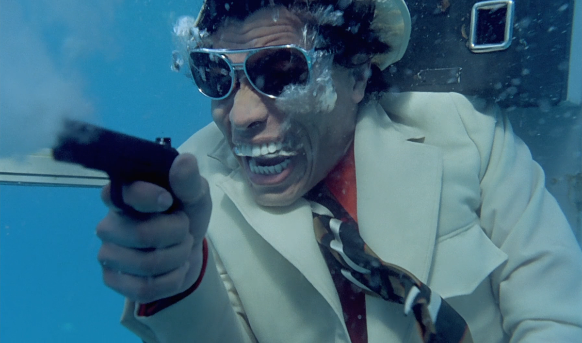 Бравурная музыка, красочный мексиканский карнавал. Из телефонной будки звонит шефу секретный агент. Над будкой зависает вертолет и, подцепив ее на трос, летит в сторону моря. Отлетев от берега, вертолет сбрасывает будку вниз. На дне аквалангисты прокладывают решетчатый коридор между будкой и клеткой с акулой. Заслон поднят, хищница, подобно торпеде, вгрызается в живот агента, и изумрудные воды заволакивают клубы алой крови...