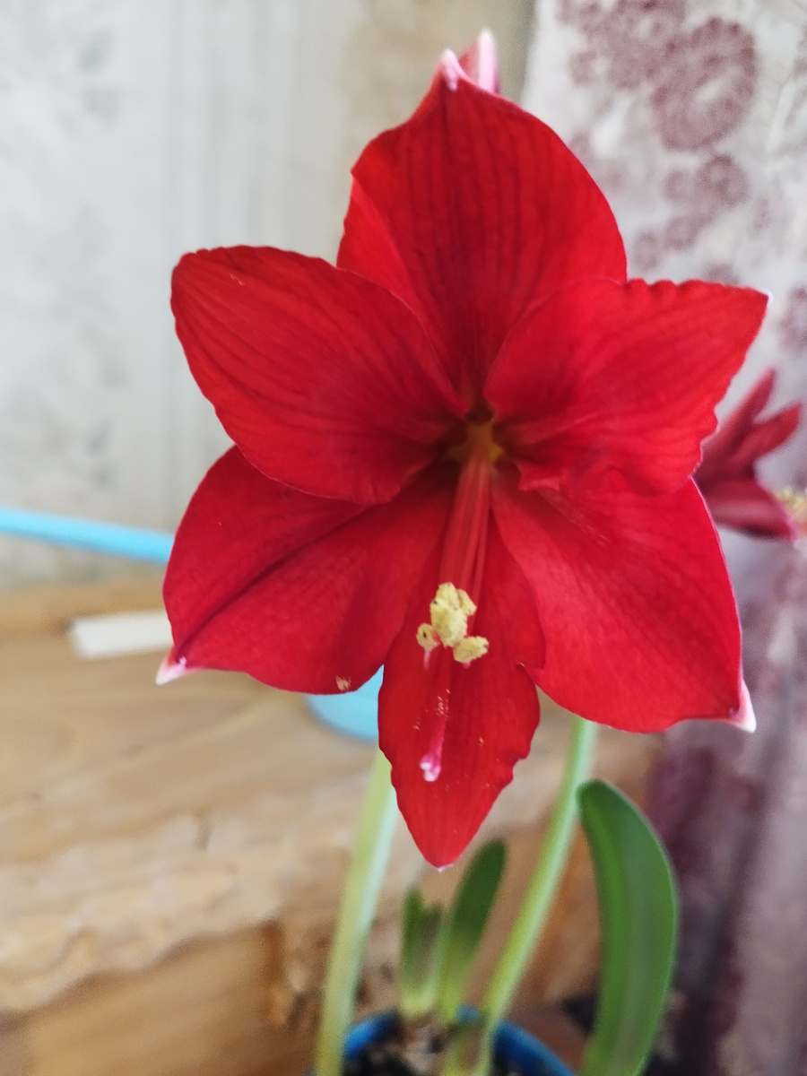Вот такое чудо вчера вытащила из-под ванной! Совсем про него забыла!!! Предыстория... Рос у меня красный гиппеаструм..Периодически цвел. Причем, в любое время года.Один раз расцвёл в день моего рождения, на 45 лет,21 июля. А на следующий год в сентябре, распустился в день рождения мужа и тоже,на 45 лет Лет 15 назад сноха принесла несколько розовых гипперов. Красивых, огромных.. Но больных...Стаганоспороз /красный ожог/ гиппеаструма .Луковицы начали гнить, мой тоже заразился, хоть и рос в другой комнате.. Что могла выходить, посадила в один горшок.. Где они и росли. Летом выставляла на лоджию.. Осенью заносила в дом. Не цвели... И вот такое чудо! Бедный, забытый, набрал бутоны без полива, в темноте и начал расцветать. Если бы ни яркий цветок, я бы его ещё долго не заметила его в дальнем углу. Достала, полила, удалила засохшие листья и чешуи. Поставила под фитолампу. Сегодня подкормлю. Сегодня начал распускаться второй цветок на стрелке.Сам цветок позеленел, ожил.