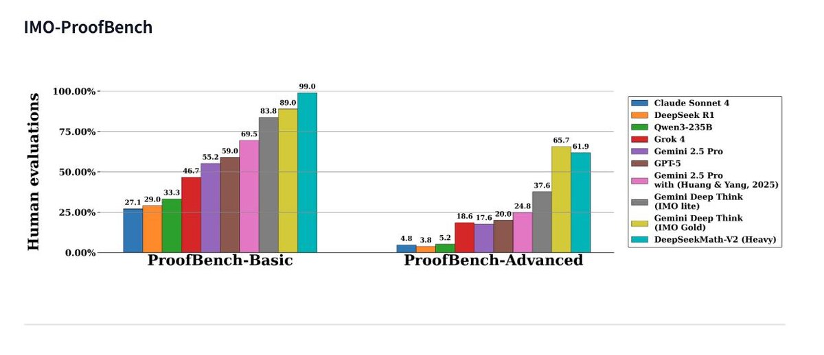 🚀 DeepSeek Вернулись Компания выпустила DeepSeek Math V2 - мощную модель для самопроверяемых математических рассуждений. Модель способна не просто решать задачи, а самостоятельно проверять корректность своих доказательств. Это шаг от генерации ответа к глубокому, надёжному и логически выверенному выводу. 📊 Результаты: - уровень золотой медали на IMO 2025 - почти идеальные результаты на CMO 2024 - 118 из 120 баллов на Putnam 2024 🔍 Главное отличие от предыдущих моделей: ИИ учится *мыслить строго*, пошагово формируя доказательство и сам проверяет логическую связность каждого шага. Модель остаётся компактной и может работать даже на одной GPU, без мощной инфраструктуры. Подходит как для автоматизированного решения задач, так и для обучения, генерации разборов и проверки решений. https://huggingface.co/deepseek-ai/DeepSeek-Math-V2 @machinelearning #AI #DeepSeek #Math #LLM #MachineLearning #OpenSource #