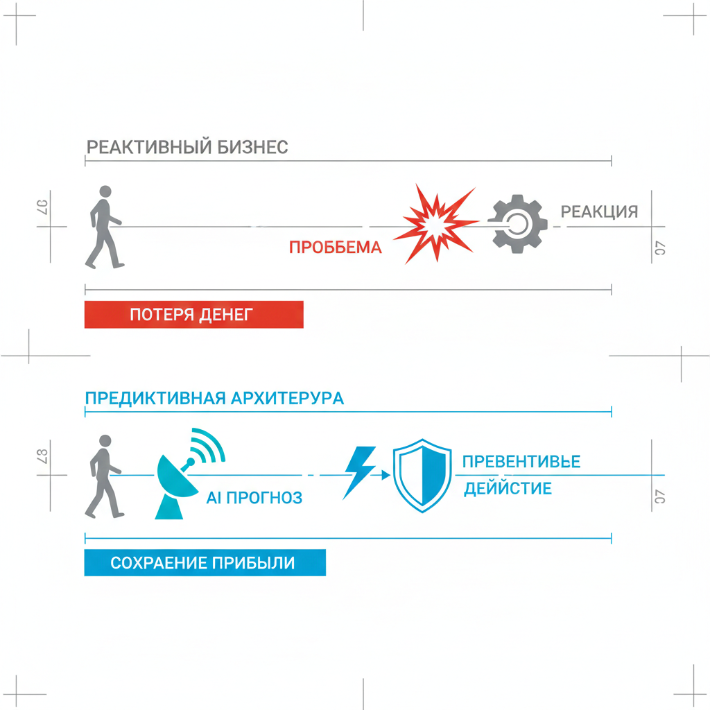 Фразы вроде «рынок диктует правила» — это лирика для бизнес-тренингов. В реальности рынок — это просто поток данных. И побеждает тот, кто умеет этот поток парсить и интерпретировать быстрее других. Большинство компаний работают в режиме «Пожарной команды». Клиент ушел — начинаем думать, почему. Продажи упали — собираем совещание. Это реактивная модель. Она дорогая и медленная. В 2026 году выживают только предиктивные архитектуры. Это системы, которые видят событие до того, как оно произошло в физическом мире. Маркетологи любят говорить: «Мы чувствуем клиента». Я предпочитаю говорить: «Мы видим отклонение в паттернах». Предиктивная аналитика — это не хрустальный шар. Это математический расчет вероятности следующего шага пользователя на основе его цифрового следа. Кейс: Механика удержания (-15% оттока) Давайте разберем пример из исходных данных, но технически. Клиент (SaaS-сервис) терял подписчиков. Как только система фиксирует совокупность этих сигналов (Scoring > 0.8), срабатывает триг