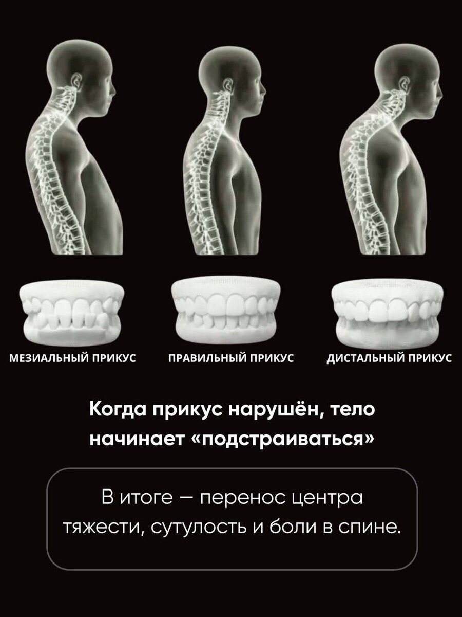 Неправильный прикус — это не только про эстетику. Это про здоровье всего организма. Типы прикуса: Правильный прикус Верхние зубы слегка перекрывают нижние. Нагрузка при жевании распределяется равномерно. Никаких проблем с височно-нижнечелюстным суставом (ВНЧС). Мезиальный прикус Нижняя челюсть выдвинута вперёд, подбородок выступает. Нижние зубы перекрывают верхние. Часто сопровождается: ▫️ Проблемами с жеванием ▫️ Преждевременным стиранием эмали ▫️ Болями в ВНЧС ▫️ Нарушением дикции Дистальный прикус Верхняя челюсть сильно выдвинута вперёд, нижняя — "задвинута" назад. Подбородок скошен. Последствия: ▫️ Затруднённое дыхание (особенно во сне) ▫️ Проблемы с жеванием ▫️ Быстрое стирание передних зубов ▫️ Напряжение мышц лица Что происходит с телом: Неправильный прикус смещает центр тяжести всего тела. Почему? Челюсти, череп и позвоночник связаны через мышцы и суставы. Цепная реакция: 1️⃣ Неправильная окклюзия (смыкание зубов) 2️⃣ Напряжение мышц челюсти и шеи 3️⃣ Смещение головы вперёд ил