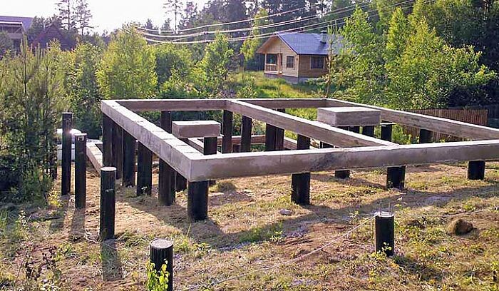 Ростверковый фундамент — это конструкция, где на сваях или столбах выше уровня земли (“ростверк” — от слова “ростер” или “решётка”) укладывается бетонная балка, которая и несёт на себе здание. Такой способ идеален для: